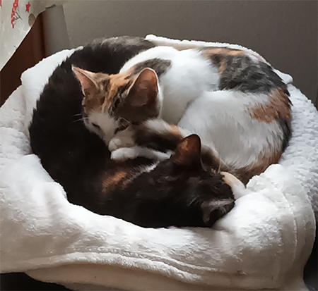 Lilly ist inzwischen richtig bei uns angekommen, eigentlich schon innerhalb der 1. Woche, und fühlt sich sehr wohl. Xenia und Lilly kommen auch gut miteinander zurecht. Sie spielen, toben und jagen einander, aber auch gemeinsames Kuscheln und gegenseitiges Putzen tun die beiden. Nur die geballte Energie und Ungestümtheit von Lilly - Kitten halt - wird Xenia manchmal zu wild. Sie schaut dann ganz entsetzt und geht dann aus der “Schusslinie”. Aber auch Lilly ist stark verwundert, wenn Xenia ihre 5 Minuten hat… Es wird mit jedem Tag besser, alles braucht halt seine Zeit, das hat inzwischen auch mein Mann eingesehen. Wir Menschen fallen ja auch nicht jedem gleich um den Hals.